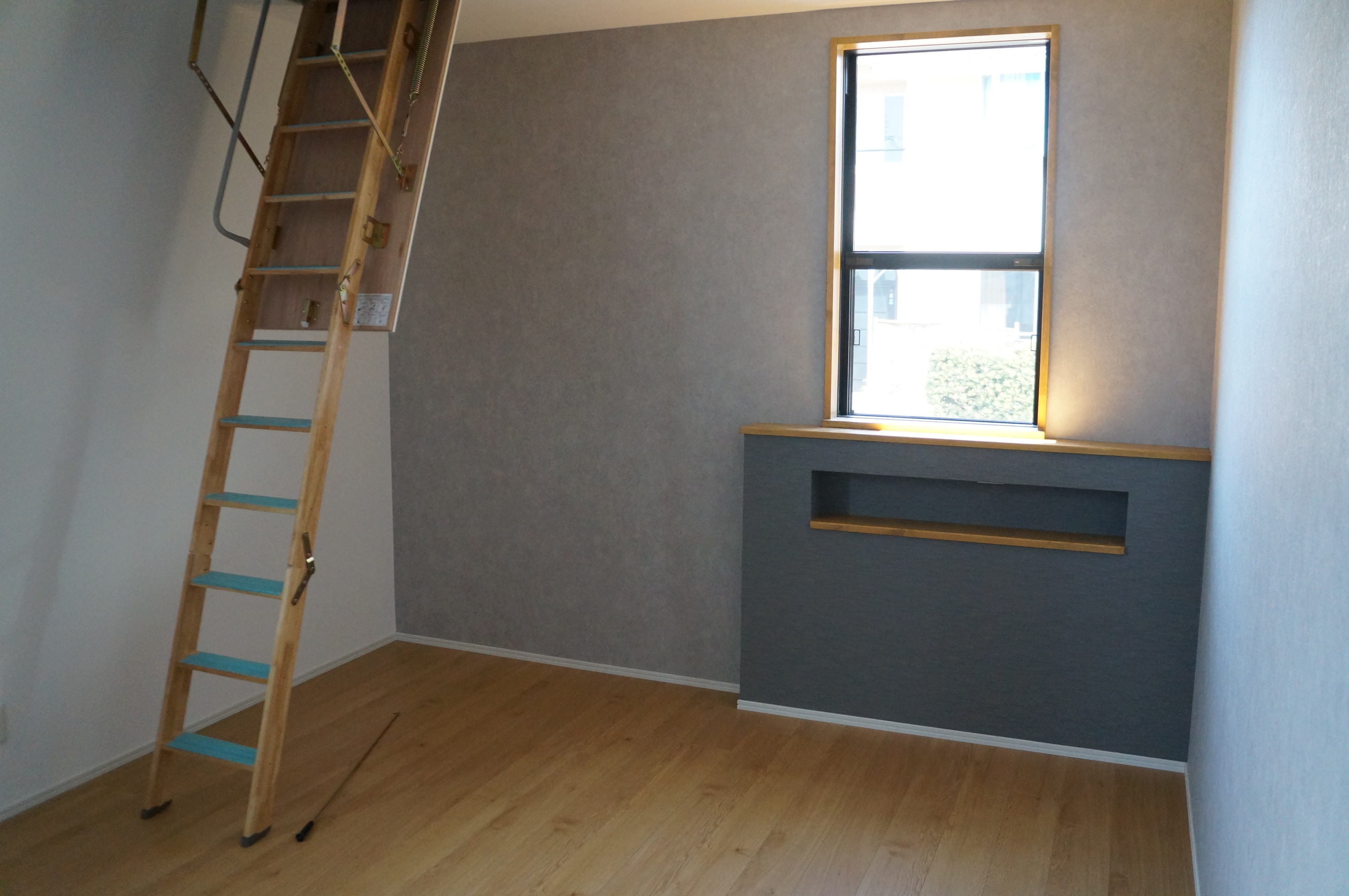 昇降式の階段は小屋裏収納への上がり口です。大容量で普段使用しないものを上げておけます。