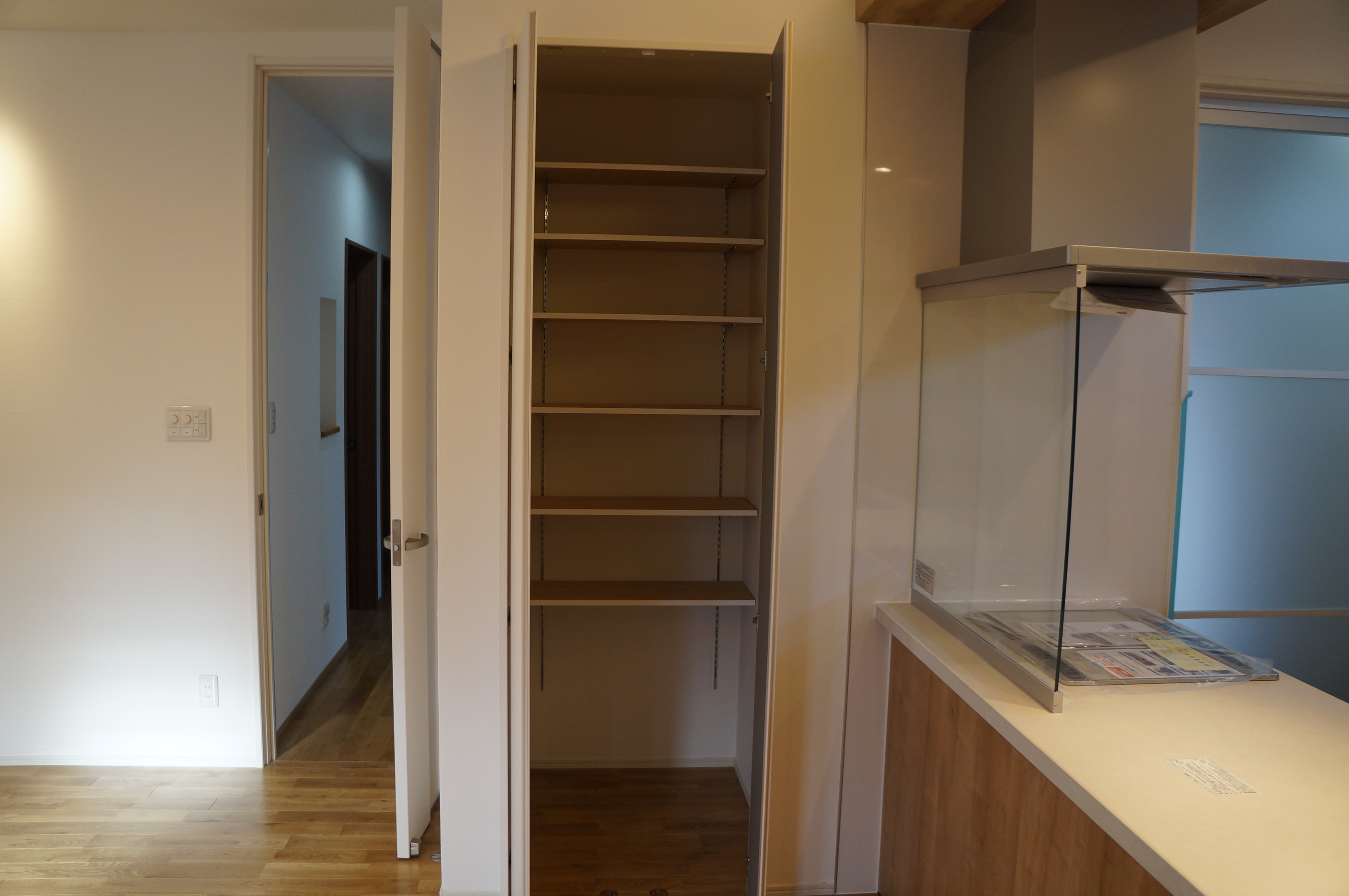 キッチン。右側に調味料等置ける棚を造作。
