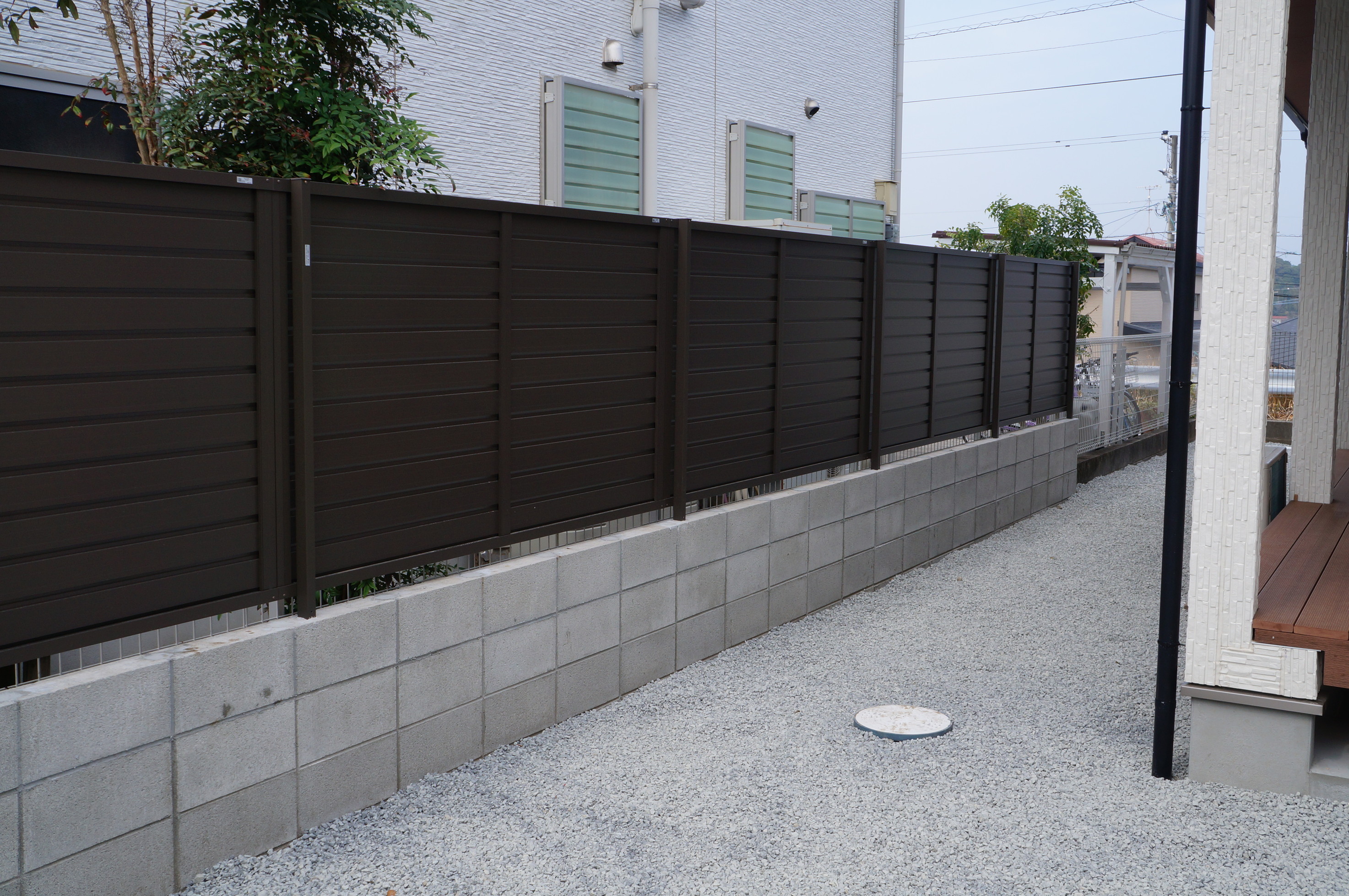 LIXILのGスクリーンでエコキュートと玄関前をやわらかく目隠し。